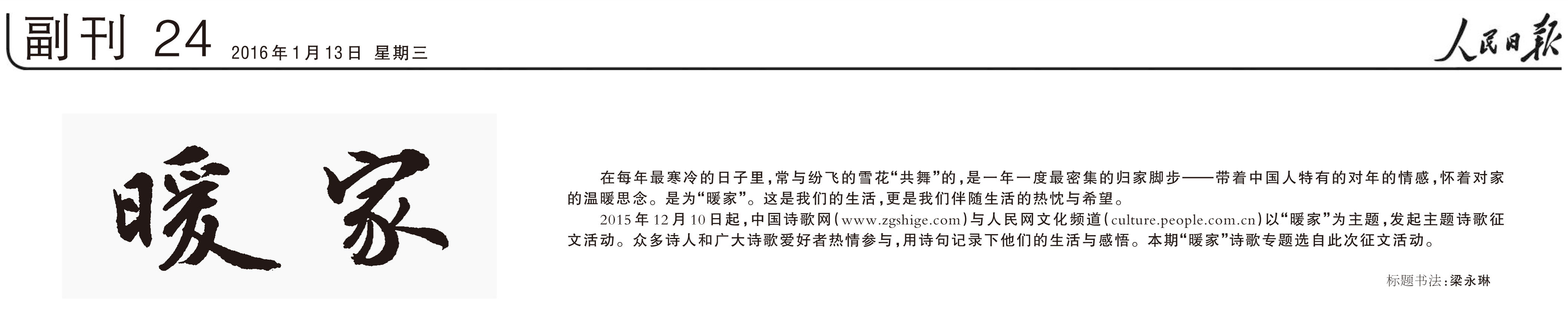 中国诗歌网12月1日讯(周敬启 胡曼) 2016猴年已到,中国诗歌网祝贺广大诗人和网友新年快乐。每年春节前后,人潮汹涌,就为“暖家”。2015年12月10日0时起,中国诗歌网(www.zgshige.com)联合人民文化网文化频道(culture.people.com.cn),以“暖家”为主题,发起为期4个月的主题诗歌征文活动,号召广大诗人和诗歌爱好者用诗句记录点滴感触。据中国诗歌网透露,本次“暖家”主题诗歌征文,特等奖的奖金为1万元。